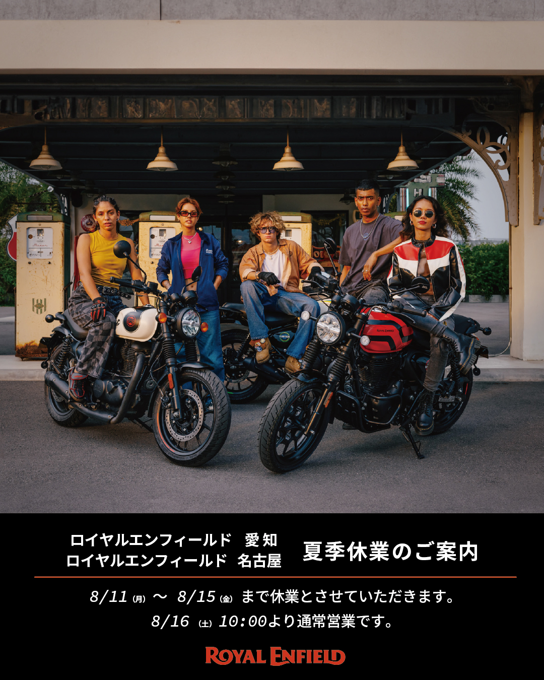 夏季休業のご案内 2025年8月8日 お知らせ ロイヤルエンフィールド愛知・ロイヤルエンフィールド名古屋は、下記の通りで夏季休業とさせていただきます。 8月11日(月)~8月15日(金) ☆8月16日(土)10:00~ 通常営業とさせていただきます。